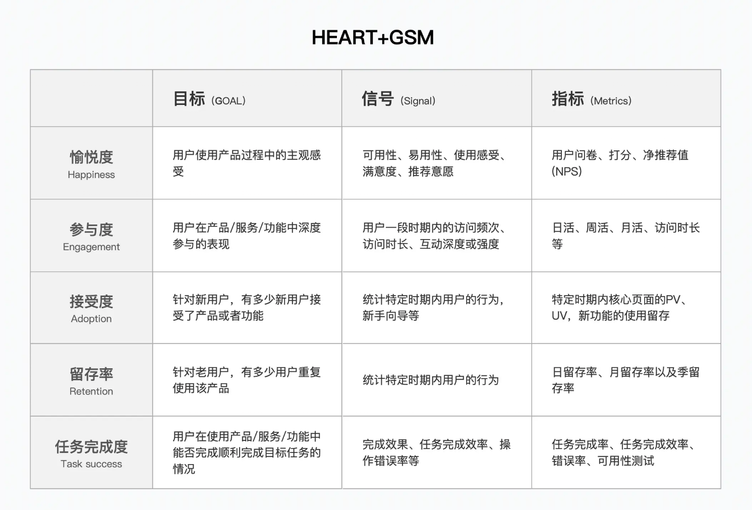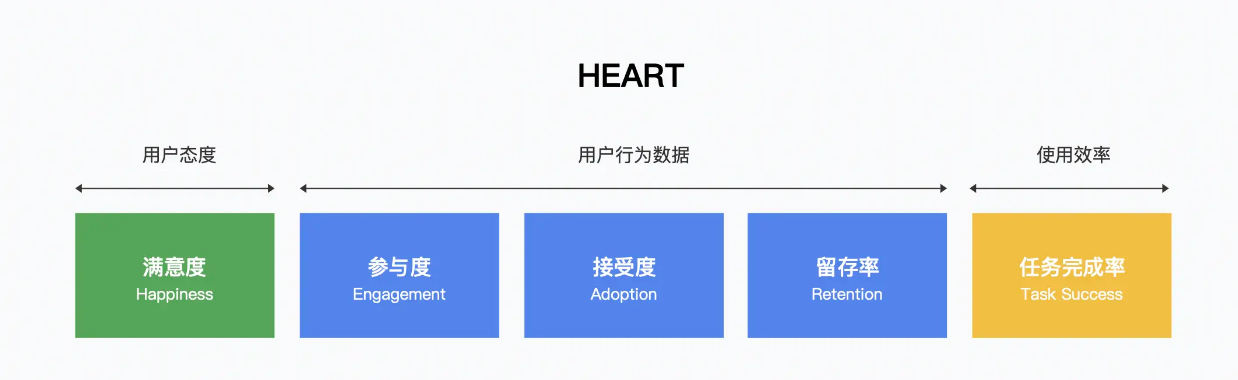 基于PULSE中存在的不足,结合用户体验质量以及让数据更有实际意义的需求,我们提出了一个作为补充的度量框架:HEART。