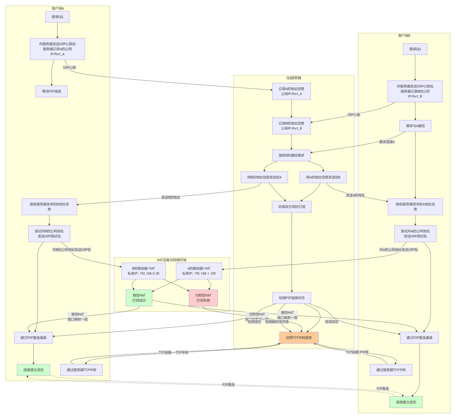 这个流程图清晰地展示了QQ UDP打洞技术的完整流程: